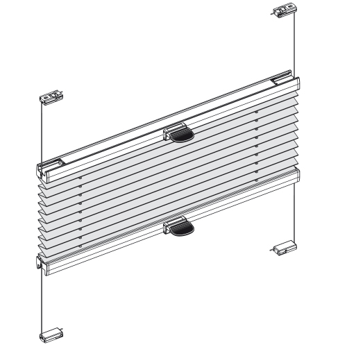 Denna lutande modell gör det möjligt att sätta solskydd i fönster som inte är lodräta, tex takfönster. Plisségardinen manövreras enkelt med ett lätt tryck på handlaget eller med en dragkäpp om fönstret sitter långt upp. Gardinen monteras i fönstret med hjälp av linor, vilket gör att den följer fönstret även när det är öppet. Modellen kan tillverkas i storlekar upp till 150 cm i bredd, men med hög höjd för långa takfönster.